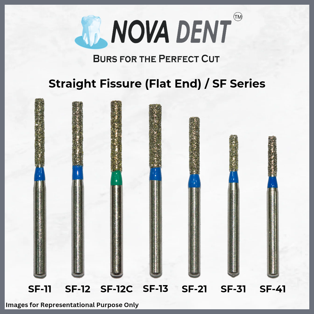 Nova Dent Straight Flat End / Straight Fissure (SF Series) Burs are precision-engineered dental instruments made with high-quality diamond points, ensuring exceptional durability and performance. Also known as Straight Fissure Burs, they deliver superior cutting efficiency, making them ideal for various dental procedures. These burs are crafted to provide smooth, precise cuts and are perfect for achieving accurate preparations in dentistry. ( Straight Fissure Flat End Burs )